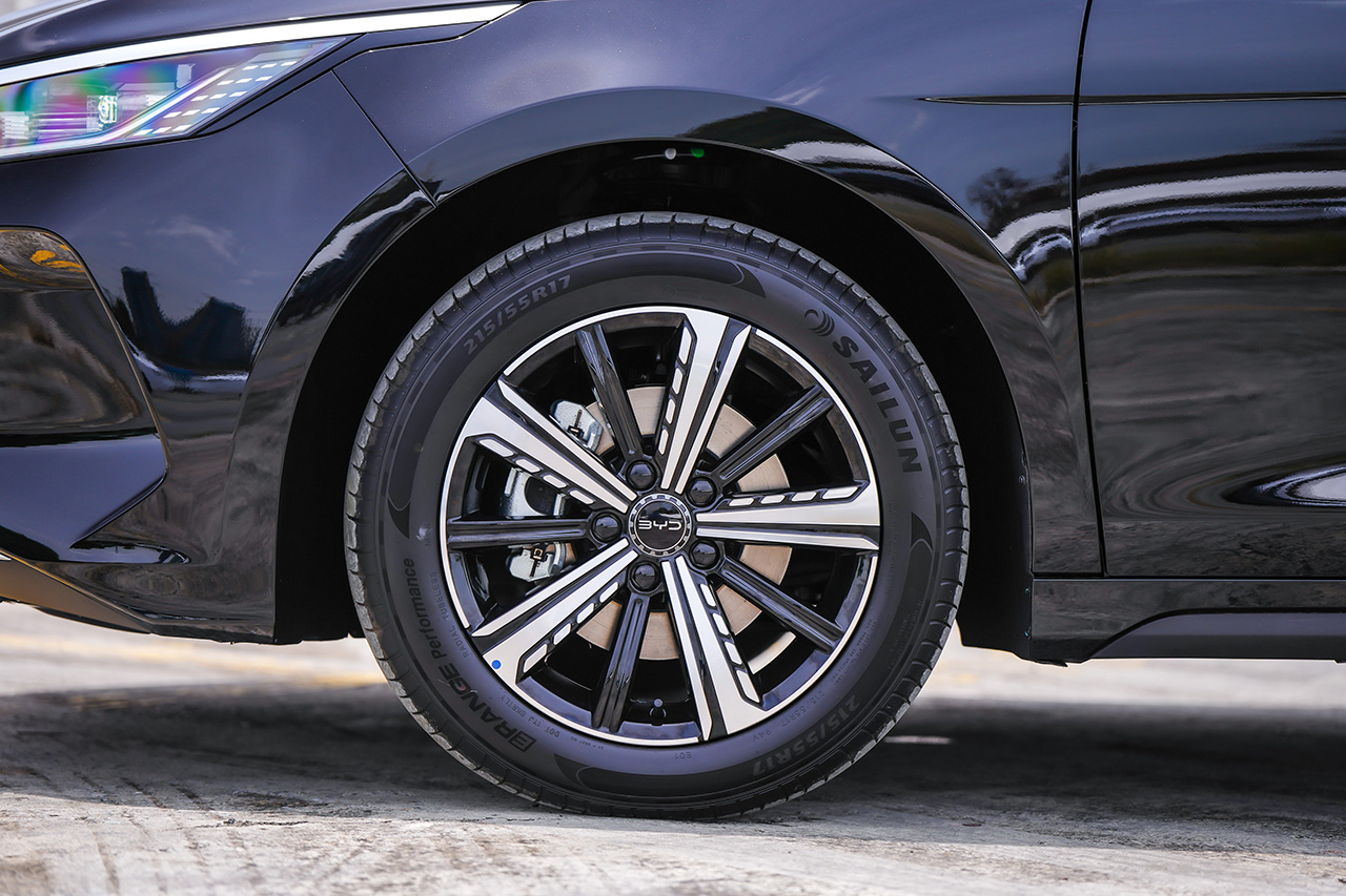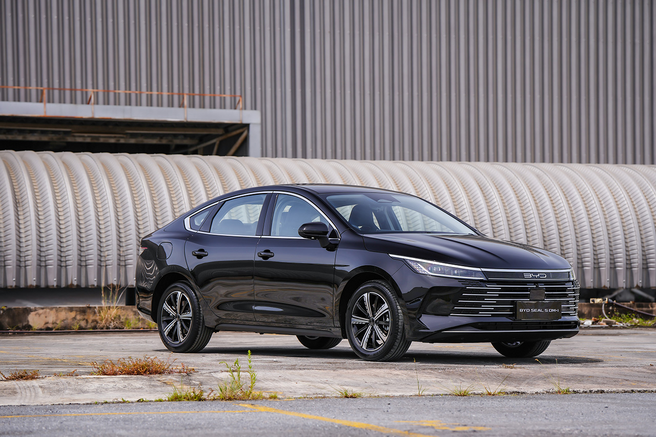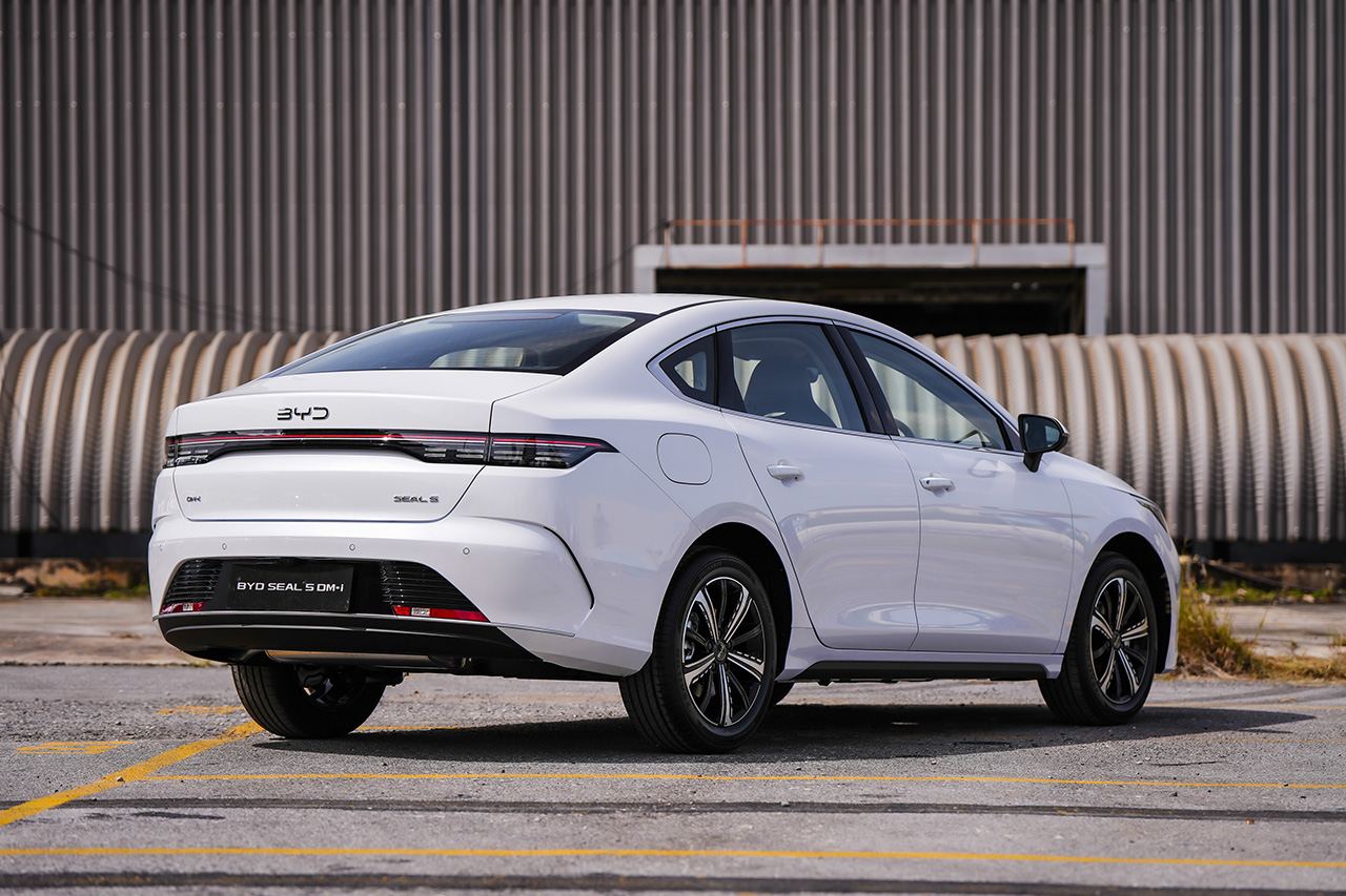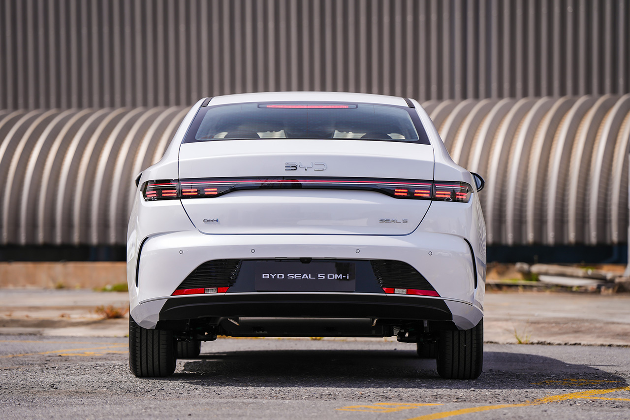 BYD SEAL 5 DM-i SUPER HYBRID is a midsize sedan powered by a plug-in hybrid (PHEV) powertrain. It features BYD’s Ocean Aesthetics design language with a frameless Dot Matrix grille, full LED headlamps and taillights, smoked LED taillight bar with sequential rear turn signals, and 17-inch alloy wheels with 215/55R17 tires.