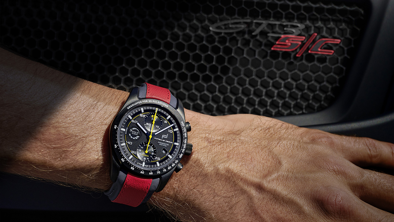 พิเศษสำหรับเจ้าของ 911 GT3 S/C ปอร์เช่ ดีไซน์นำเสนอนาฬิกาข้อมือ โครโนกราฟ 911 GT3 S/C (Chronograph 911 GT3 S/C) มาพร้อมระบบ Porsche Design calibre WERK 01.200 ที่ผ่านการรับรองความเที่ยงตรงจาก COSC และฟังก์ชัน Flyback ตัวเรือนผลิตจากไทเทเนียมน้ำหนักเบาพิเศษ พร้อมตัวเลือกเคลือบไทเทเนียมคาร์ไบด์สีดำ ผสานดีไซน์รถสปอร์ตเข้ากับศิลปะการผลิตนาฬิการ่วมสมัย หน้าปัดดีไซน์ GT 3 ตกแต่งด้วยโทนสีเหลืองและลวดลายหกเหลี่ยม ถ่ายทอดแรงบันดาลใจจากแผงหน้าปัดของรถ พร้อมโรเตอร์ไขลานที่ออกแบบตามล้อแมกนีเซียม ขอบสีของหน้าปัดสามารถเลือกได้ตามสีภายนอกของ 911 GT3 S/C รวมถึงสีจากโปรแกรม Paint to Sample และสายนาฬิกาที่ผลิตจากหนังภายในรถปอร์เช่พร้อมด้ายเย็บที่ปรับให้เข้ากับรูปแบบของรถแต่ละคันอย่างเฉพาะตัว
