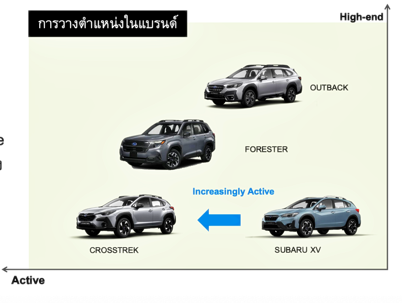 ความสนุก กิจกรรม แอคทีฟ คล่องตัว ลุย โลดโผน ผสมคำเข้าไปจนมีชื่อว่า "CROSSTREK" ถ่ายทอดคุณค่าจากรุ่น FLAGSHIP ของ SUBARU คุณภาพการควบคุมให้เทียบเคียง “WRX” ในร่าง “BABY OUTBACK” การวางตำแหน่งในแบรนด์