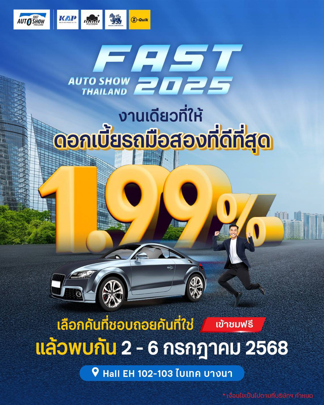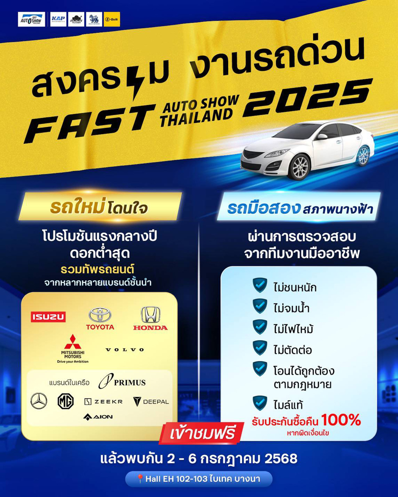 “Fast Auto Show Thailand 2025” kicks off, reaffirming its important role as a mid-year platform driving the automotive industry. The event brings together leading car brands and high-quality used cars under one roof, offering special deals designed to stimulate consumer purchasing power with the concept: “Great deals on new cars, guaranteed genuine-mileage used cars with buyback assurance.” Admission is free from today until July 6, 2025, at BITEC Bangna, Halls 102-103, from 10:00 a.m. to 9:00 p.m.
