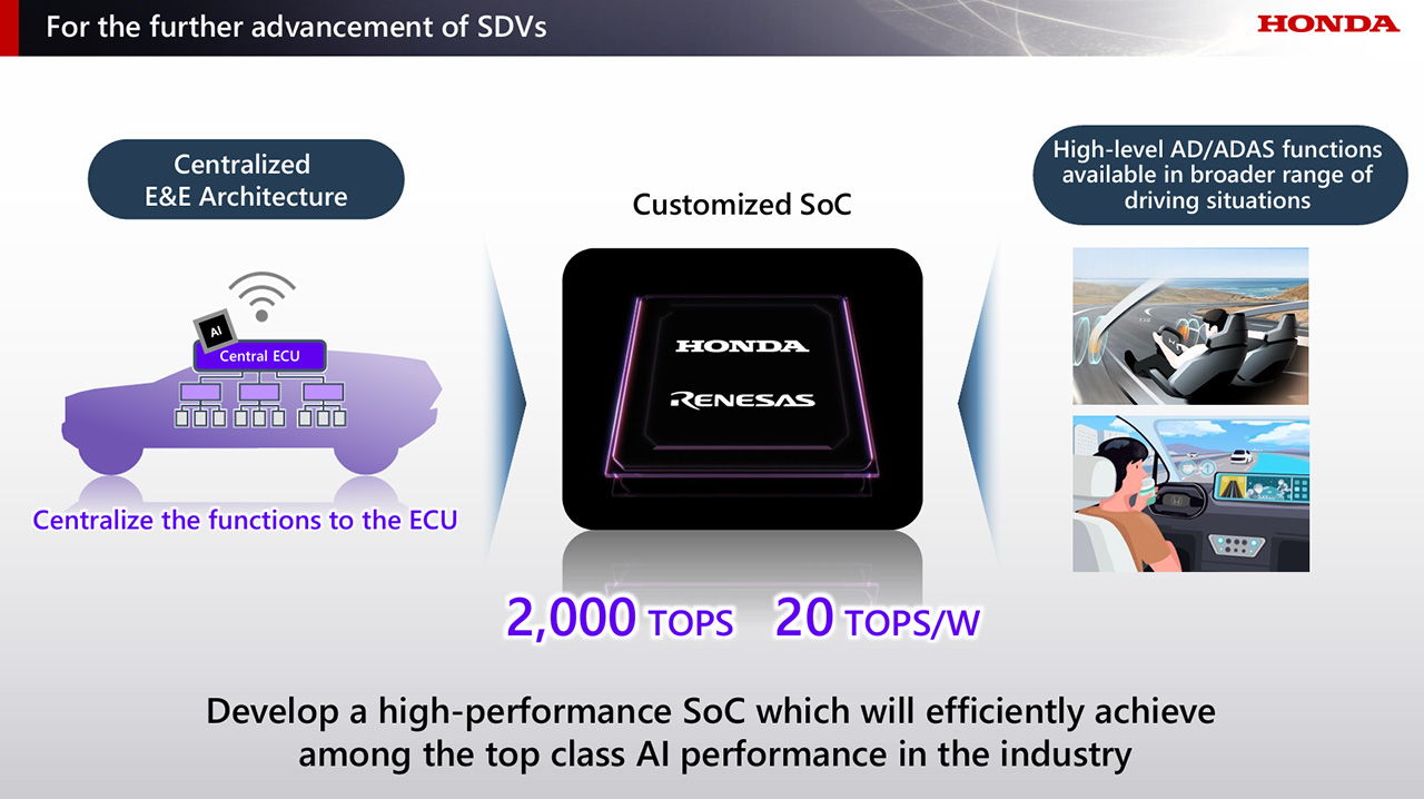 Honda 0 Series จะเป็นเสาหลักสำคัญของธุรกิจรถยนต์ไฟฟ้า (EV) ของ Honda ในอนาคต รุ่นแรกของซีรีส์นี้จะเริ่มวางจำหน่ายในปีหน้า โดยผ่านรถรุ่นเหล่านี้ ฮอนด้าจะมอบคุณค่าของ SDV (Software-Defined Vehicle) ที่ปรับให้เหมาะสมกับผู้ใช้งานแต่ละรายอย่างละเอียดถี่ถ้วน ภายใต้แนวคิด “การปรับแต่งเฉพาะบุคคลขั้นสูง (Ultra-personal Optimization)” ซึ่งเป็นไปได้ด้วยเทคโนโลยี ASIMO OS และ ระบบ AD/ADAS ที่ฮอนด้าได้เปิดตัวในงาน CES 2025 รถในเจเนอเรชันถัดไปของ Honda 0 Series จะถูกติดตั้งด้วย Centralized E&E Architecture นอกจากนี้ ฮอนด้าจะร่วมมือกับ Renesas Electronics เพื่อพัฒนาชิปประมวลผล (System-on-Chip) ประสิทธิภาพสูง ซึ่งจะให้สมรรถนะ AI ระดับแนวหน้าของอุตสาหกรรม