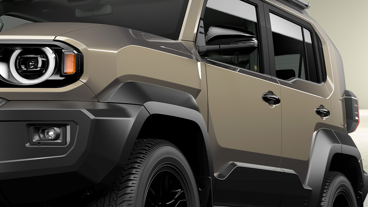 The Land Cruiser FJ features a boxy body design, emphasizing a square-shaped cabin to provide a spacious interior and ample cargo capacity, staying true to the philosophy of all previous Land Cruiser generations. The vehicle’s body adopts a rectangular shape with chamfered edges, inspired by a dice motif. It also comes with large bumpers and flared fenders, while both front and rear corner bumpers are designed as segmented removable parts, allowing damaged sections to be replaced easily for improved repairability and customization.
