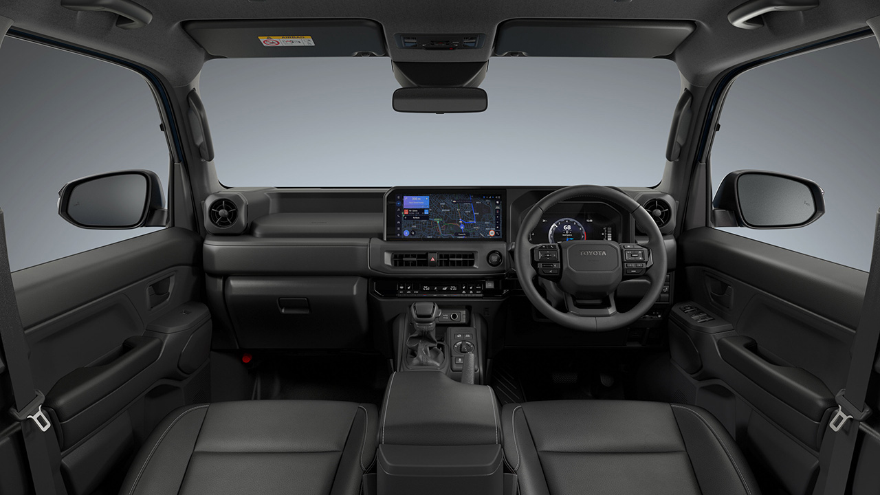 Inside, the Land Cruiser FJ features a two-row, five-seat cabin designed for easy driving and precise control. The horizontal dashboard helps the driver easily perceive the vehicle’s tilt angle, while the monitor and switches are positioned close at hand to reduce eye movement. The gear lever is ergonomically designed for natural operation. A low-set hood and instrument panel enhance forward visibility, while the low beltline allows a clear view of the road surface even during off-road driving. Safety-wise, the vehicle comes equipped with Toyota Safety Sense, which includes advanced technologies such as the Pre-Collision Safety System.