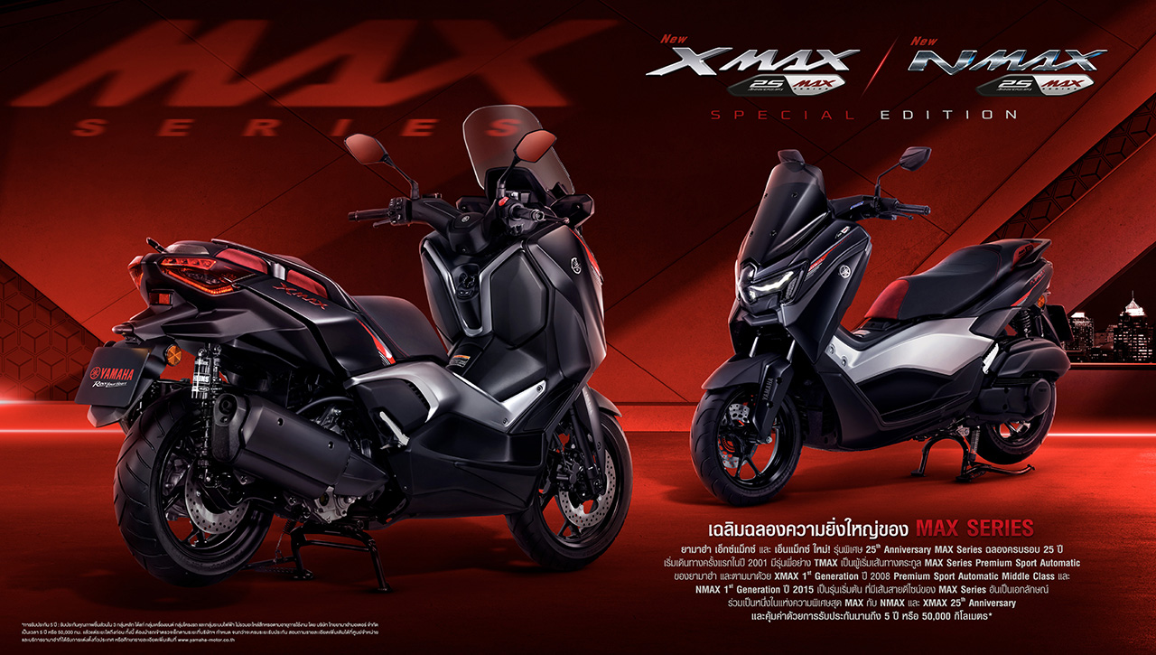นอกจากนี้ ลูกค้าที่ครอบครอง NEW YAMAHA XMAX และ NEW YAMAHA NMAX รุ่นพิเศษ 25th Anniversary MAX Series จะได้รับแพ็กเกจการรับประกันนานสูงสุด 5 ปี หรือ 50,000 กิโลเมตร ครอบคลุมชิ้นส่วนหลักทั้งเครื่องยนต์ โครงสร้างตัวรถ และระบบไฟฟ้า ตามเงื่อนไขบริษัทฯ