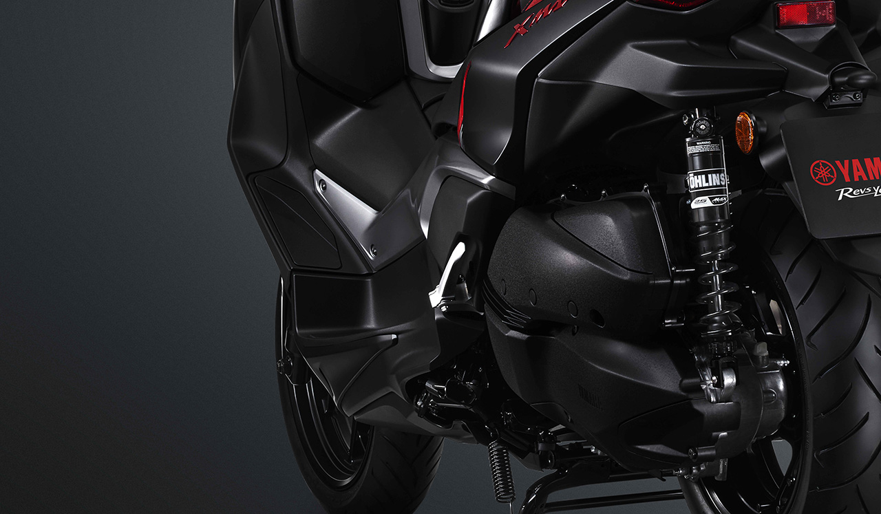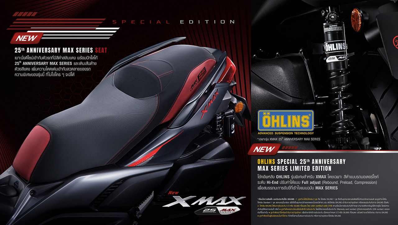 ในส่วนของ XMAX รุ่น 25th Anniversary ได้รับการอัปเกรดสมรรถนะด้วยโช้คอัพหลัง Limited Edition จาก Öhlins Racing AB โทนสีดำ รองรับการปรับตั้งแบบ Full Adjust ครบทั้ง Rebound, Preload และ Compression
