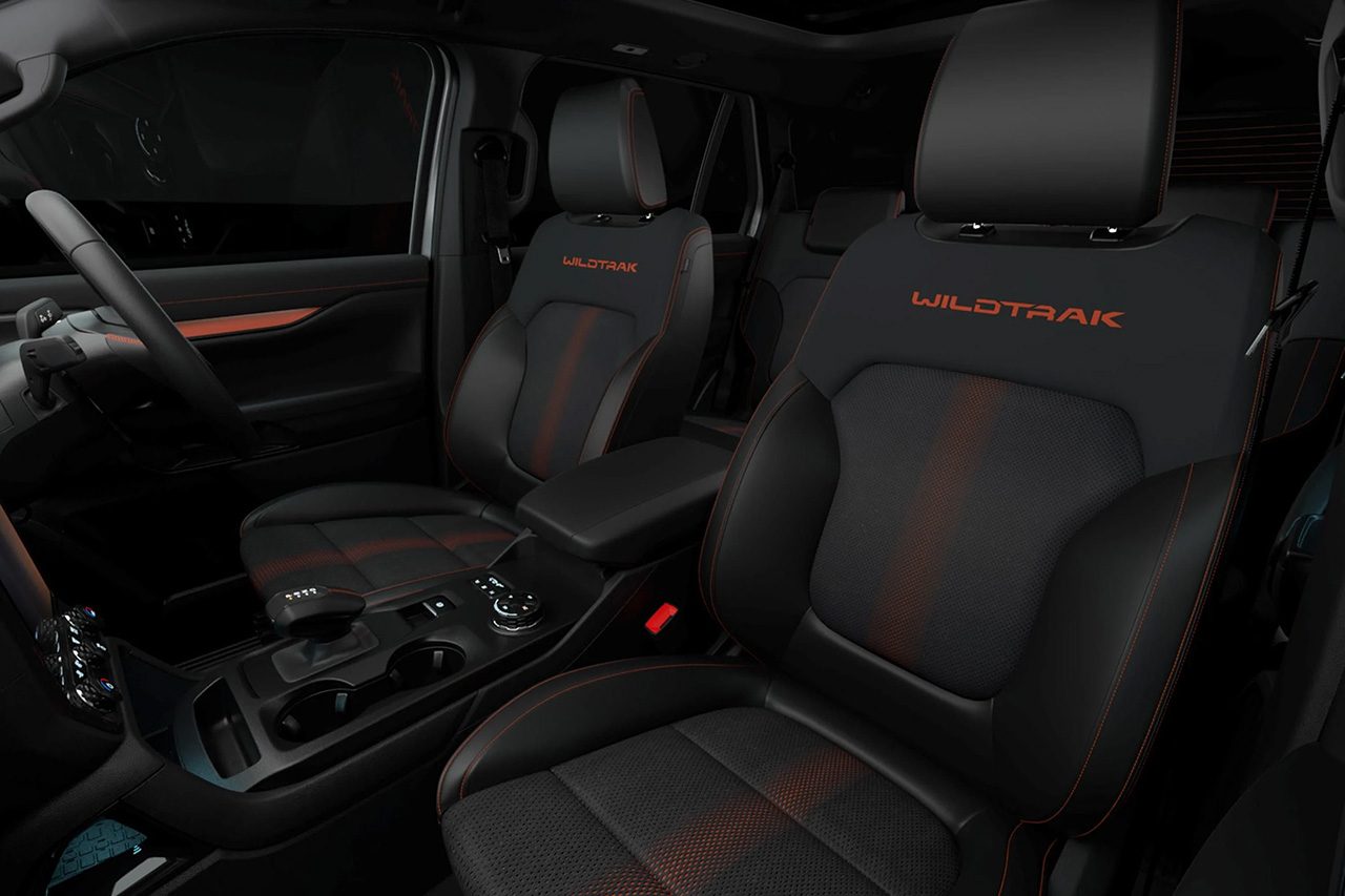 ภายในห้องโดยสารตกแต่งด้วยโลโก้ Wildtrak และเดินด้ายสีส้มบนเบาะกึ่งหนัง พร้อมเบาะแถวที่สามปรับไฟฟ้า และหลังคาพาโนรามาพร้อมม่านไฟฟ้าเป็นอุปกรณ์มาตรฐาน