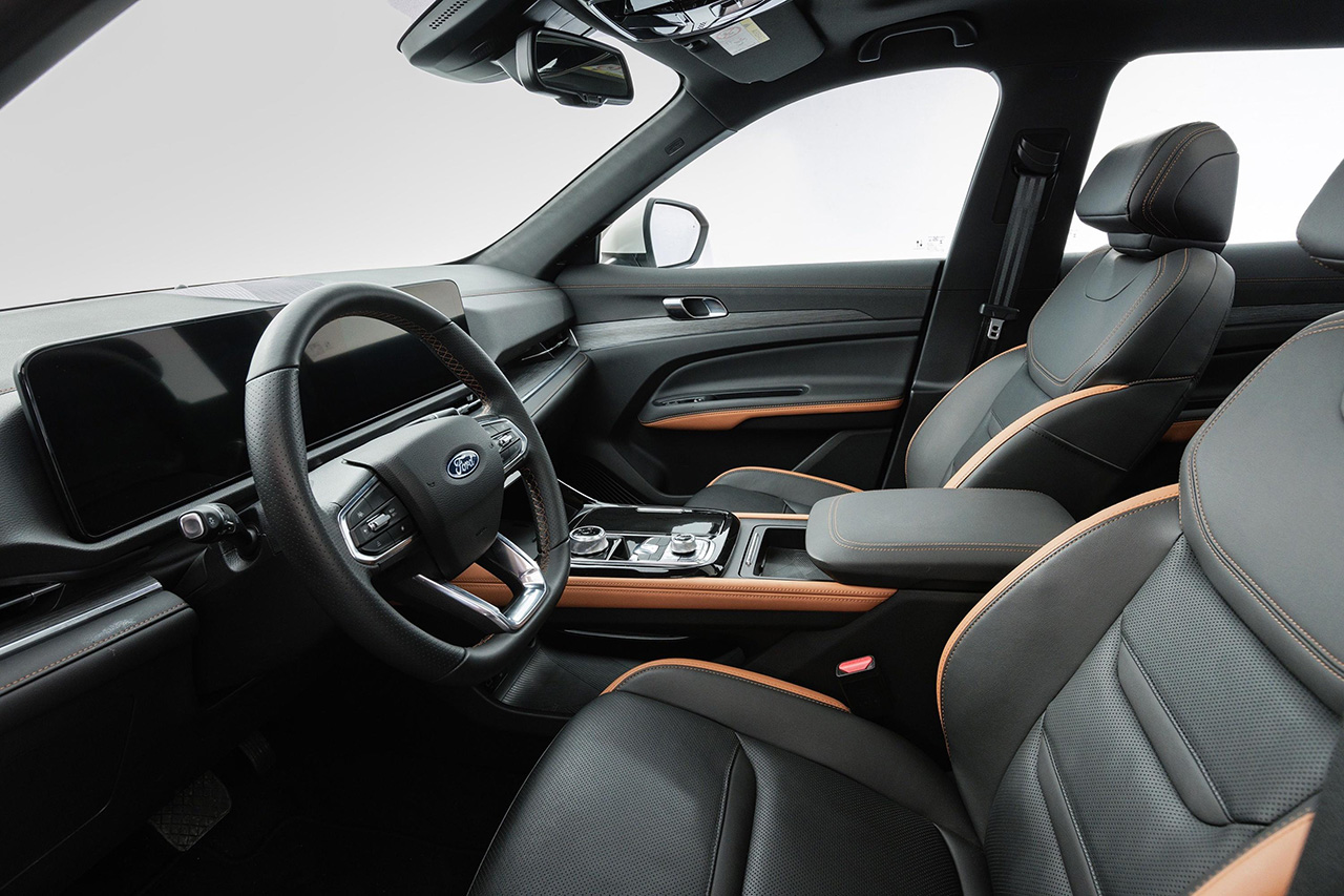 ภายในห้องโดยสารตกแต่งด้วยโทนสีเทาและน้ำตาล เบาะหนังแบบมีรูระบายอากาศปรับไฟฟ้า พร้อมหลังคากระจกพาโนรามา หน้าจอกลางแบบสัมผัสขนาด 12.3 นิ้ว มาตรวัดดิจิทัลขนาดเท่ากัน ระบบ Ford Co-Pilot 360 ที่รวมระบบช่วยจอดอัตโนมัติ ปุ่มควบคุมเกียร์แบบหมุน และแท่นชาร์จมือถือไร้สายเป็นอุปกรณ์มาตรฐาน