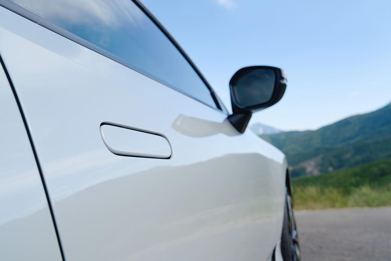 ดีไซน์ภายนอกเน้นความโฉบเฉี่ยวและกล้ามชัด ฝากระโปรงเตี้ย ฐานล้อกว้าง หลังคาทรง “Double-Bubble” และซุ้มล้อโป่งครอบล้อ 19 นิ้ว รายละเอียดพิเศษ เช่น กระจังหน้าดำโครเมียม แถบสีฟ้าบริเวณกันชนหน้า-หลัง และคาลิปเปอร์เบรกสีฟ้าเฉพาะรุ่น ใช้มือจับประตูแบบเรียบ เสาอากาศฝังในกระจกท้าย และเทคโนโลยีเชื่อมหลังคาแบบ Laser Brazing เพื่อความเรียบเนียน