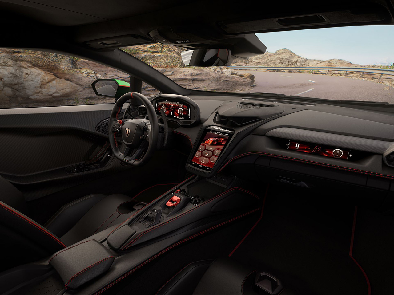 ภายในห้องโดยสารตกแต่งวัสดุคุณภาพสูง เช่น คาร์บอนไฟเบอร์, หนังแท้, และ ผ้าหนังกลับ Corsatex by Dinamica โดยหลายชิ้นส่วนสามารถเลือกเป็น คาร์บอนไฟเบอร์ ได้ เช่น แผงคอนโซลกลาง ช่องแอร์ แผงประตู แผงหน้าปัด พวงมาลัย และคอพวงมาลัย องค์ประกอบที่เป็นเอกลักษณ์ของ Lamborghini ก็ยังคงมีอยู่เช่นเดิม เช่น ปุ่ม Start/Stop แบบ Power Button ที่ได้รับแรงบันดาลใจจากเครื่องบิน คันเกียร์ไฟฟ้า e-gear แถบสีแดงบนพวงมาลัย พวงมาลัยสามารถเลือกเสริมด้วยคาร์บอนไฟเบอร์ โดยรวมปุ่มควบคุมฟังก์ชันการขับขี่หลักทั้งหมดไว้ในมือเดียว ด้านซ้ายมือของพวงมาลัยมี ตัวหมุนสีแดง (Red-Crowned Rotor) สำหรับเลือกโหมดการขับขี่ ด้านล่างประกอบด้วย ปุ่มยกตัวรถ (Lift Function) ปุ่ม Race Start สำหรับออกตัวแบบรถแข่งและสวิตช์ไฟเลี้ยวอยู่ตรงกลางระหว่างทั้งสองปุ่ม