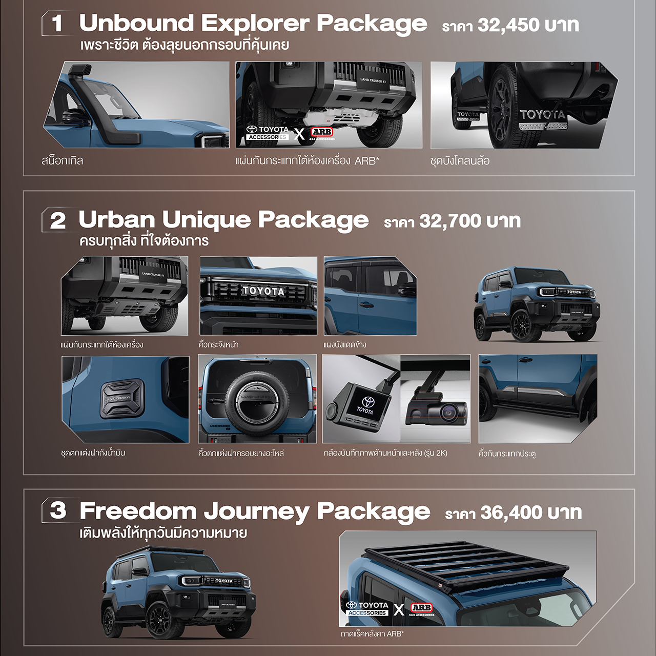 นอกจากนี้ Toyota ยังแนะนำชุดอุปกรณ์ตกแต่งแท้จาก Toyota Accessories สำหรับ Land Cruiser FJ อีก 3 แพคเกจ รายละเอียดดังนี้