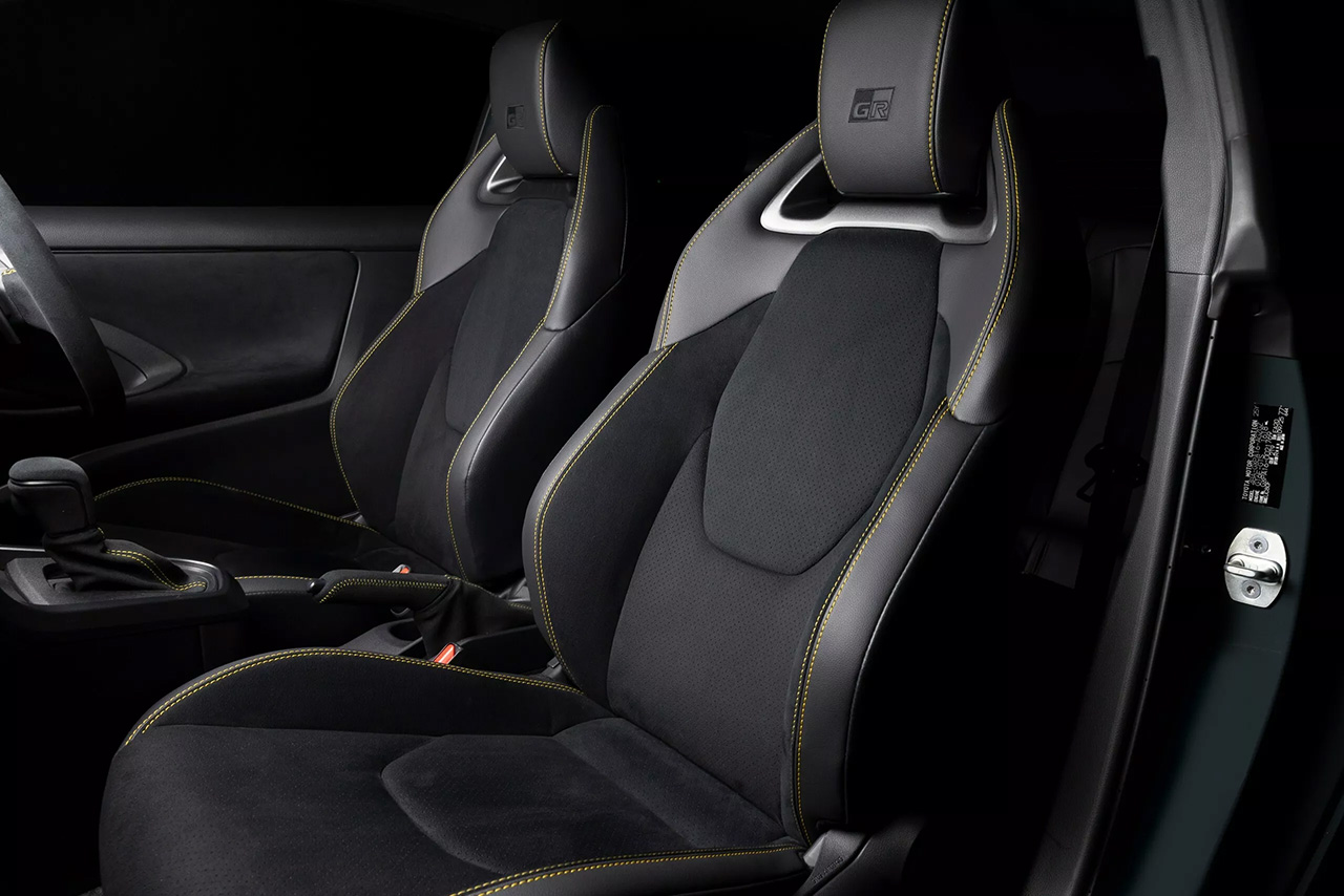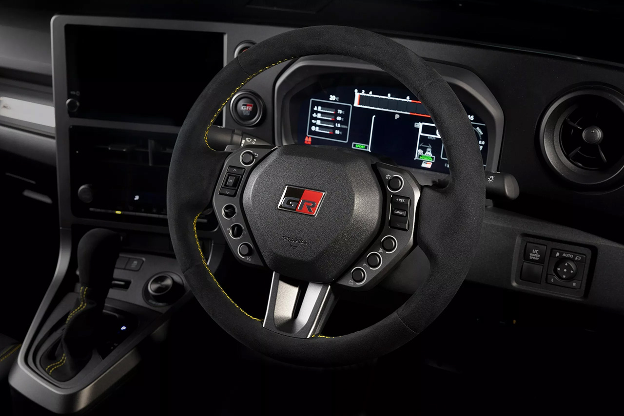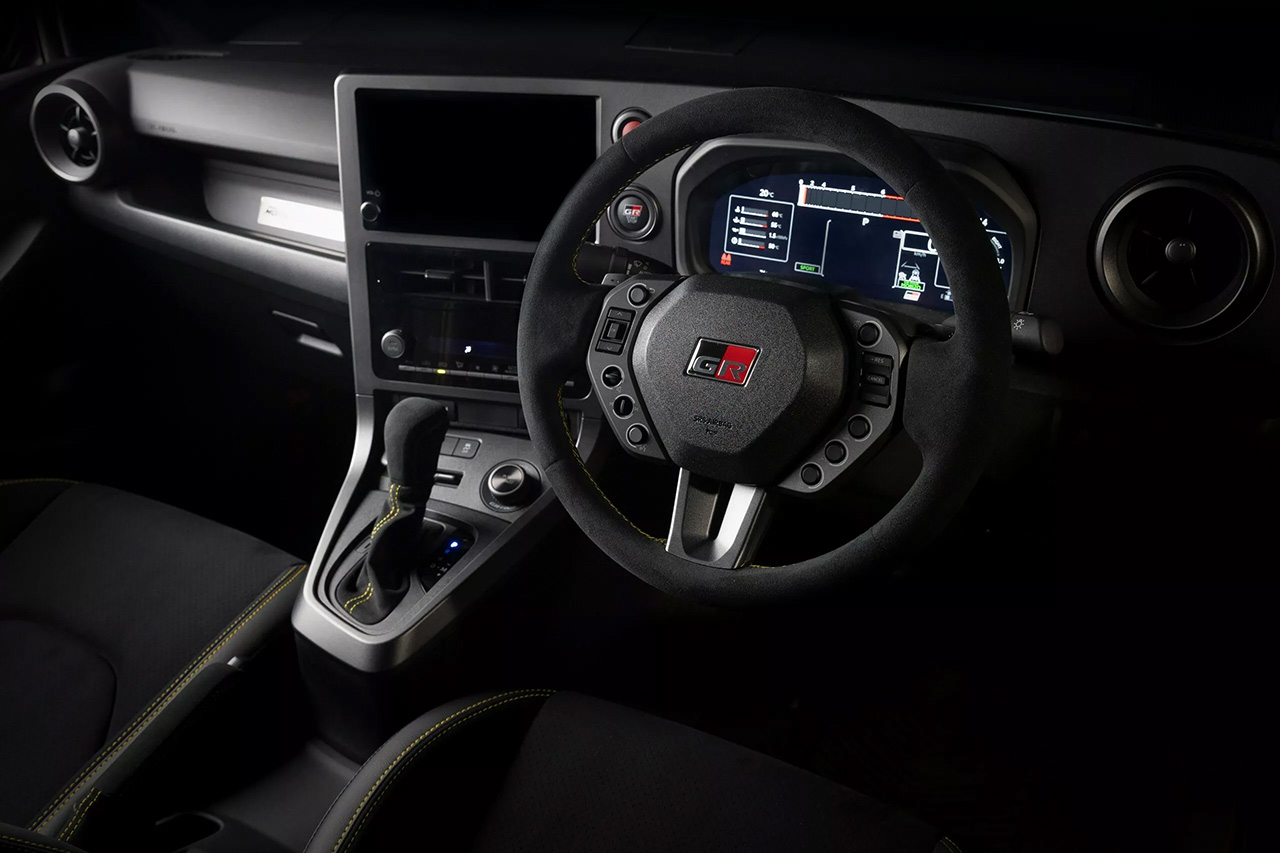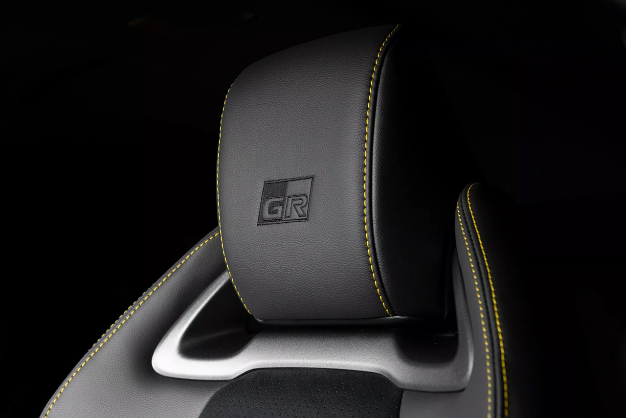 ภายในห้องโดยสารตกแต่งด้วยวัสดุหนังกลับ พร้อมด้ายเย็บสีเหลืองบนพวงมาลัย GR เบาะนั่งเฉพาะรุ่นพร้อมด้ายเย็บสีเหลือง และมีโหมด Morizo แสดงผลบนหน้าจอมาตรวัดดิจิทัล