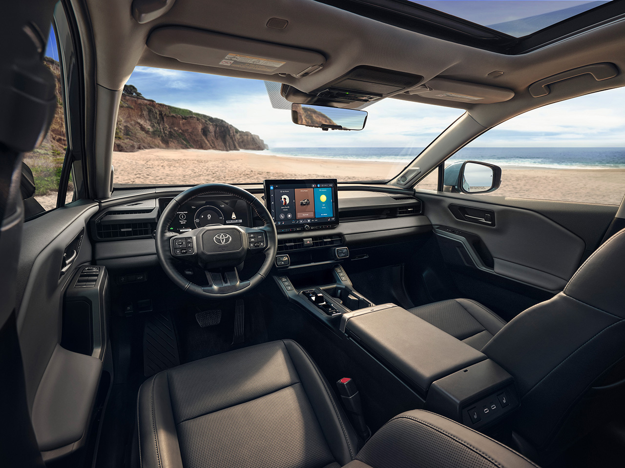 ภายในของ RAV4 ก็ได้รับการปรับโฉมใหม่เช่นกัน มาพร้อมหน้าจอมาตรวัดแบบดิจิทัลขนาด 12.3 นิ้วใหม่ซึ่งเป็นอุปกรณ์มาตรฐาน และมาพร้อมกับหน้าจออินโฟเทนเมนต์แบบลอยตัว ซึ่งมีให้เลือกทั้งขนาด 10.5 นิ้ว หรือ 12.9 นิ้ว ขึ้นอยู่กับรุ่นย่อย ยังสามารถเลือกติดตั้งจอแสดงผลแบบ Head-Up Display ได้ในรุ่นย่อยที่สูงขึ้น ปุ่มควบคุมระบบปรับอากาศถูกตัดออกไป แต่จะถูกแสดงผลแบบถาวรที่ด้านล่างของหน้าจอสัมผัสตรงกลาง ถัดจากปุ่มโฮม เพื่อความสะดวกในการใช้งาน คอนโซลกลางที่ออกแบบใหม่ ซึ่งมีช่องวางแก้วน้ำ 2 ช่อง และช่องเก็บของเพิ่มเติม ลำโพง 6 ตำแหน่ง โดยสามารถเลือกอัพเกรด เป็นระบบเสียง JBL Premium Audio แบบ 9 ลำโพงได้ โตโยต้ามีตัวเลือกวัสดุตกแต่งภายในหลากหลายแบบให้เลือก ไม่ว่าจะเป็นผ้า, SofTex, หรือ Ultrasuede แบบเจาะรู แล้วแต่รุ่นย่อยที่เลือก ในแต่ละรุ่นยังมีรายละเอียดเฉพาะ เช่น พรมปูพื้นแบบกันน้ำ และเบาะสีพิเศษ Mineral ในรุ่น Woodland หรือ ตราสัญลักษณ์ Gazoo Racing และ แป้นเหยียบอะลูมิเนียม ในรุ่น GR Sport