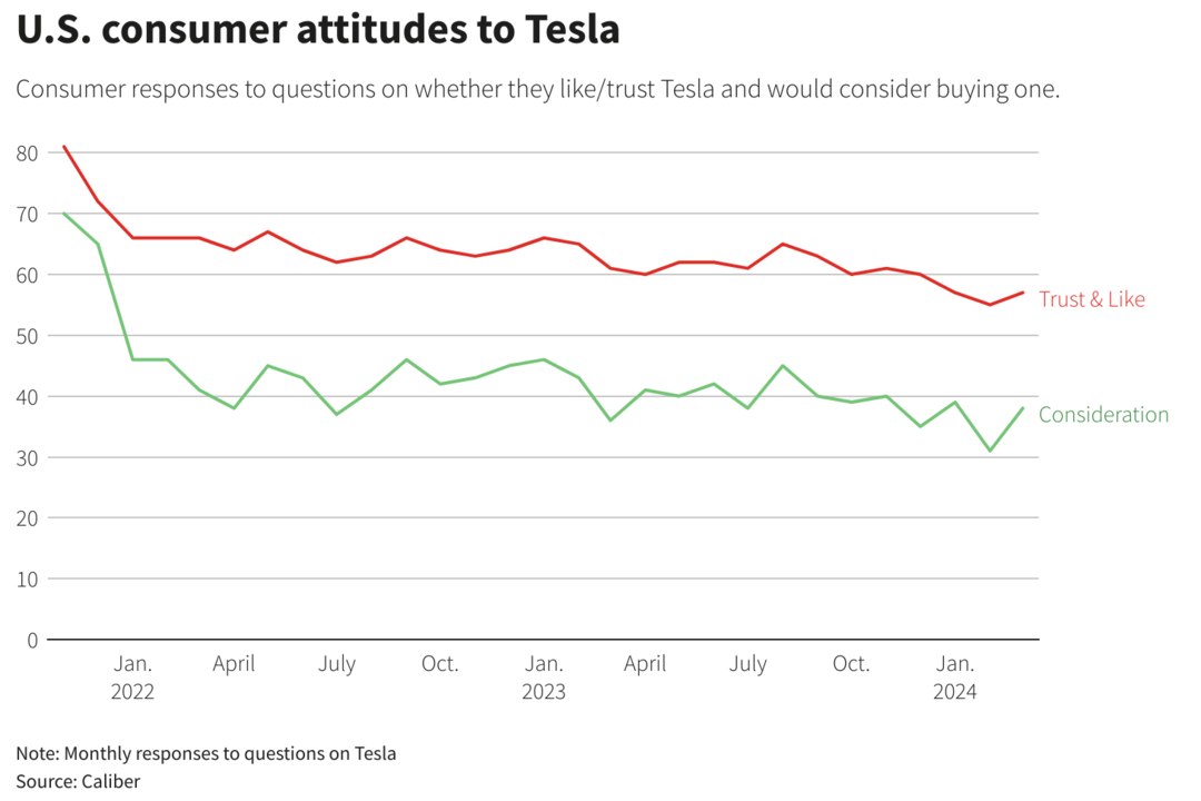 Reuters บริษัทข่าวกรองด้านการตลาดรายงานว่า Caliber ได้ทำการสำรวจโดยเผยให้เห็นว่า "คะแนนการพิจารณา" ของ Tesla ซึ่งเป็นตัวชี้วัดโดยตรงถึงกลุ่มบุคคลที่มีแนวโน้มจะซื้อรถยนต์ของแบรนด์ใดแบรนด์หนึ่งเมื่อซื้อรถยนต์ใหม่ ลดลงมากกว่าครึ่งหนึ่งจากทั้งหมด 15 เดือนที่ผ่านมา