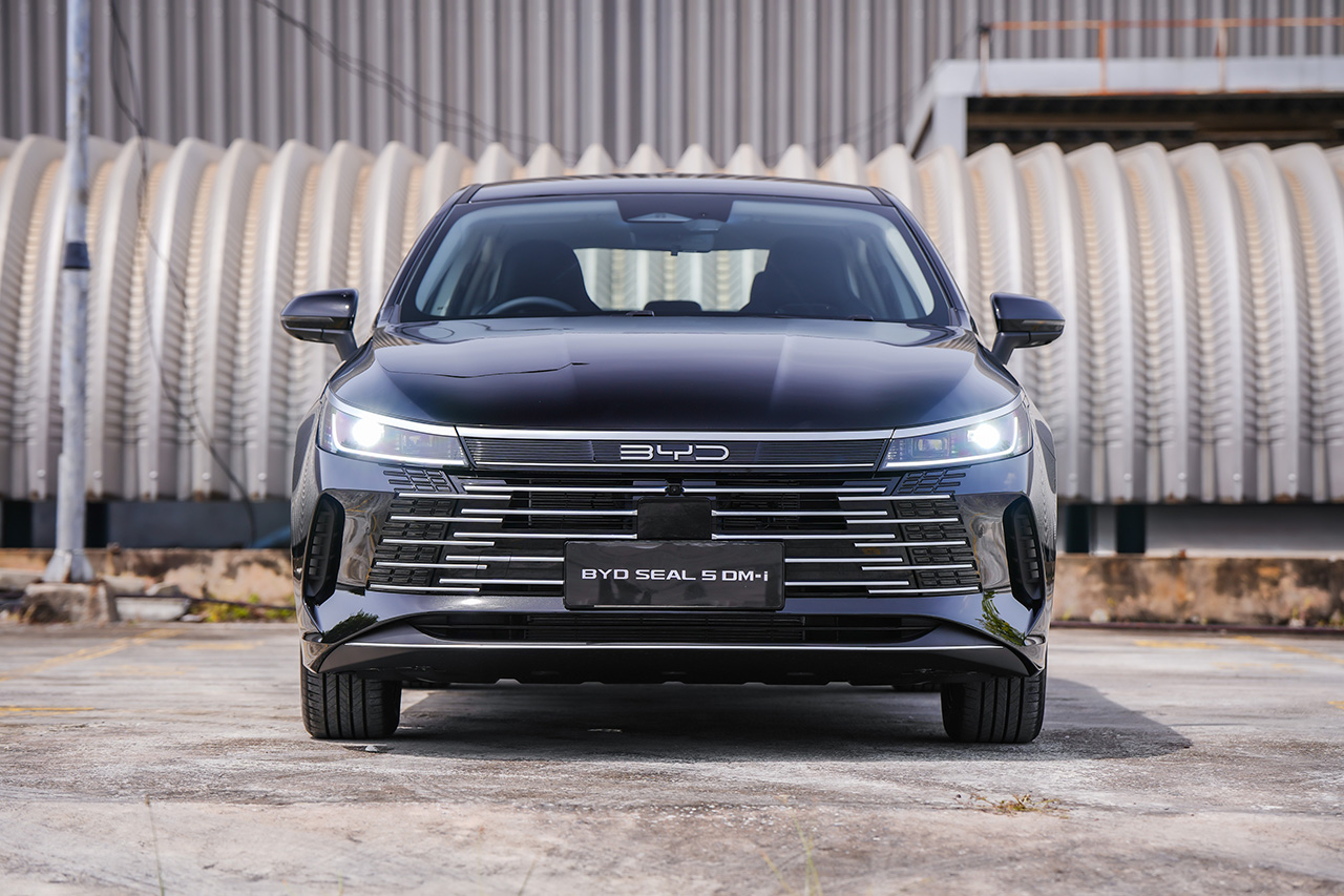 BYD SEAL 5 DM-i SUPER HYBRID is a midsize sedan powered by a plug-in hybrid (PHEV) powertrain. It features BYD’s Ocean Aesthetics design language with a frameless Dot Matrix grille, full LED headlamps and taillights, smoked LED taillight bar with sequential rear turn signals, and 17-inch alloy wheels with 215/55R17 tires.