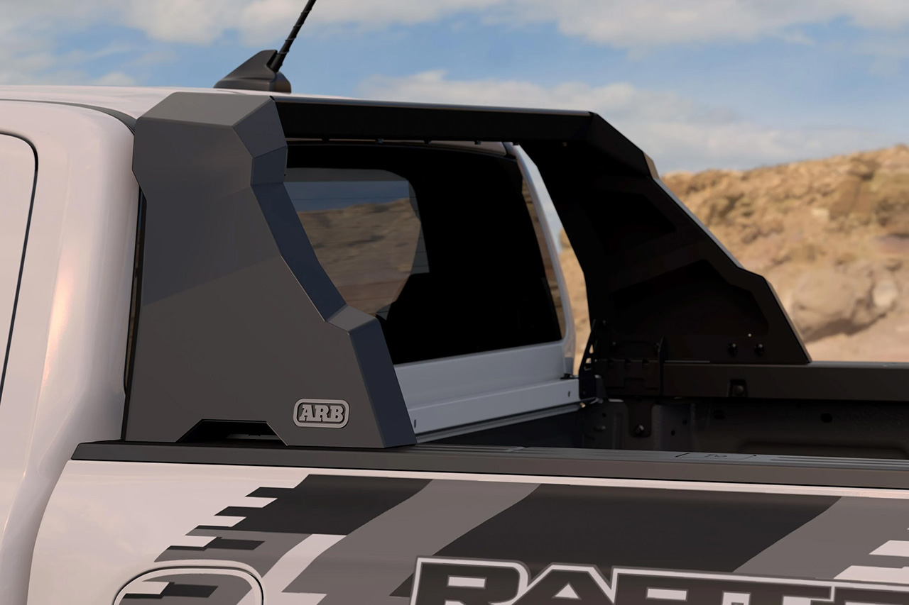 The first highlight in the package is the ARB “Nacho Quatro” roof-mounted lamps, which improve visibility during night driving. The four LED lights are arranged in pairs on a custom roof bar shaped like a spoiler, paired with an ARB Sports Bar on the rear bed. However, Ford notes that the factory Power Roller Shutter cannot be used with the new sports bar. Additionally, the bright roof lights may interfere with DAB+ digital radio signals.