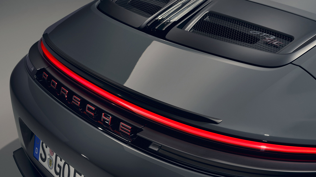 หลังคาสีดำจับคู่กับกรอบกระจกหน้าที่ตกแต่งด้วยฟิล์มสีดำ พร้อมฟิล์มกันสะเก็ดหินบริเวณแผงด้านข้างในโทนสีดำด้านสร้างเอกลักษณ์เฉพาะตัวให้กับ 911 GT3 S/C พร้อมไฟหน้าแบบ Matrix LED ที่รวมทุกฟังก์ชันไฟส่องสว่างไว้ในชุดเดียว จึงไม่จำเป็นต้องติดตั้งไฟเพิ่มเติมในกันชนหน้า ซึ่งทำให้พื้นที่บริเวณช่องรับอากาศมีขนาดใหญ่ขึ้นและการออกแบบโดยรวมดูลงตัวมากยิ่งขึ้น และเป็นครั้งแรกใน 911 รุ่นเปิดประทุนที่สามารถติดตั้งสปอยเลอร์หลังแบบยกขึ้นได้ พร้อม Gurney flap เช่นเดียวกับใน 911 S/T และ 911 GT3 พร้อมทัวร์ริ่ง แพ็กเกจ (Touring Package) อีกทั้งลิ้นสปอยเลอร์ด้านหน้าและดิฟฟิวเซอร์ด้านหลังยังถ่ายทอดมาจาก 911 GT3 รุ่นปัจจุบัน