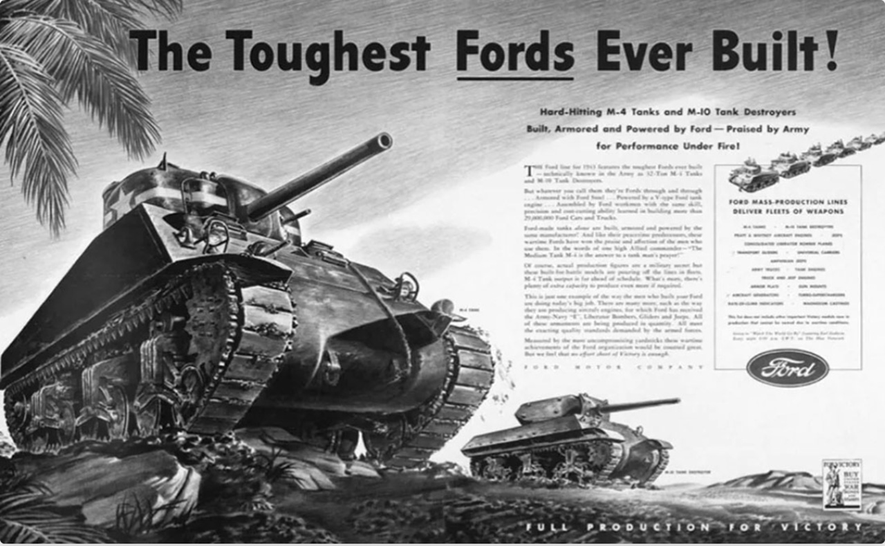 ระหว่างสงครามโลกครั้งที่ 2 ฟอร์ด มอเตอร์ คอมพานี ยุติการผลิตรถพลเรือนทั้งหมด เพื่อทุ่มเททรัพยากรให้กับกองทัพพันธมิตร