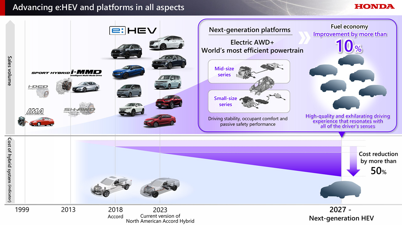 ฮอนด้าจะพัฒนาระบบ e:HEV ทั้งในรุ่นขนาดเล็กและขนาดกลาง โดยหวังให้ระบบ e:HEV เป็นระบบส่งกำลังที่มีประสิทธิภาพสูงที่สุดในโลก ด้วยการพัฒนาในหลายด้าน เช่น การขยายช่วงการทำงานที่เครื่องยนต์ให้ประสิทธิภาพสูงสุด และการเพิ่มประสิทธิภาพของระบบไฮบริดในการขับเคลื่อน ฮอนด้ายังมีแผนผสานระบบ e:HEV เข้ากับ แพลตฟอร์มเจนเนอเรชั่นใหม่ ที่ถูกพัฒนาในทุกด้าน ไม่ว่าจะเป็นเสถียรภาพในการขับขี่หรือการลดน้ำหนักตัวรถ และ ระบบขับเคลื่อนสี่ล้อไฟฟ้า (electric AWD) มุ่งหวังให้ e:HEV รุ่นใหม่ มีประสิทธิภาพการประหยัดน้ำมันเพิ่มขึ้นกว่าเดิมมากกว่า 10% และเพิ่มความสามารถในการแข่งขันด้านต้นทุนของรถยนต์ HEV บริษัทฯ กำลังดำเนินการลดต้นทุนอย่างต่อเนื่อง โดยเน้นที่ชิ้นส่วนหลัก เช่น แบตเตอรี่และมอเตอร์ การยกระดับประสิทธิภาพในการผลิต และการใช้ชิ้นส่วนร่วมกันในหลายรุ่น ฮอนด้าตั้งเป้าลดต้นทุนของระบบไฮบริดรุ่นใหม่ให้ได้มากกว่า 50% เมื่อเทียบกับระบบที่ใช้ในรถรุ่นปี 2018 และมากกว่า 30% เมื่อเทียบกับระบบที่ใช้ในรถรุ่นปี 2023