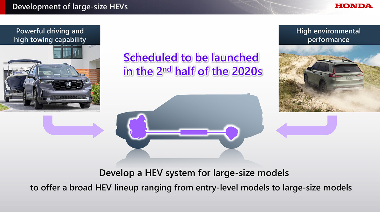 สำหรับรถยนต์พลังงานไฟฟ้า จากการปรับแผนการเปิดตัวผลิตภัณฑ์ใหม่ตามภาวะชะลอตัวของตลาดในปัจจุบัน สัดส่วนยอดขายรถยนต์ EV ทั่วโลกของฮอนด้าในปี 2030 คาดว่าจะต่ำกว่าเป้าหมายเดิมที่เคยประกาศไว้ที่ 30% ในทางกลับกัน ความต้องการของตลาดในปัจจุบันสำหรับรถยนต์ไฮบริด ยังคงอยู่ในระดับสูง ดังนั้น ฮอนด้าจึงจะวางตำแหน่งรถ HEV โดยเฉพาะรุ่นเจนเนอเรชั่นใหม่ ให้เป็นระบบขับเคลื่อนหลักในช่วงเปลี่ยนผ่านก่อนเข้าสู่ยุคของ EV อย่างเต็มรูปแบบ พร้อมทั้งเสริมความแข็งแกร่งให้กับไลน์อัพ HEV อย่างต่อเนื่อง เมื่อดำเนินการตามแผนการปรับโครงสร้างนี้ ฮอนด้าตั้งเป้าที่จะเพิ่มยอดขายรถยนต์รวมภายในปี 2030 ให้สูงกว่าระดับปัจจุบันที่ 3.6 ล้านคัน โดยมีเป้าหมายยอดขายรถ HEV อยู่ที่ 2.2 ล้านคันเป็นแกนหลัก
