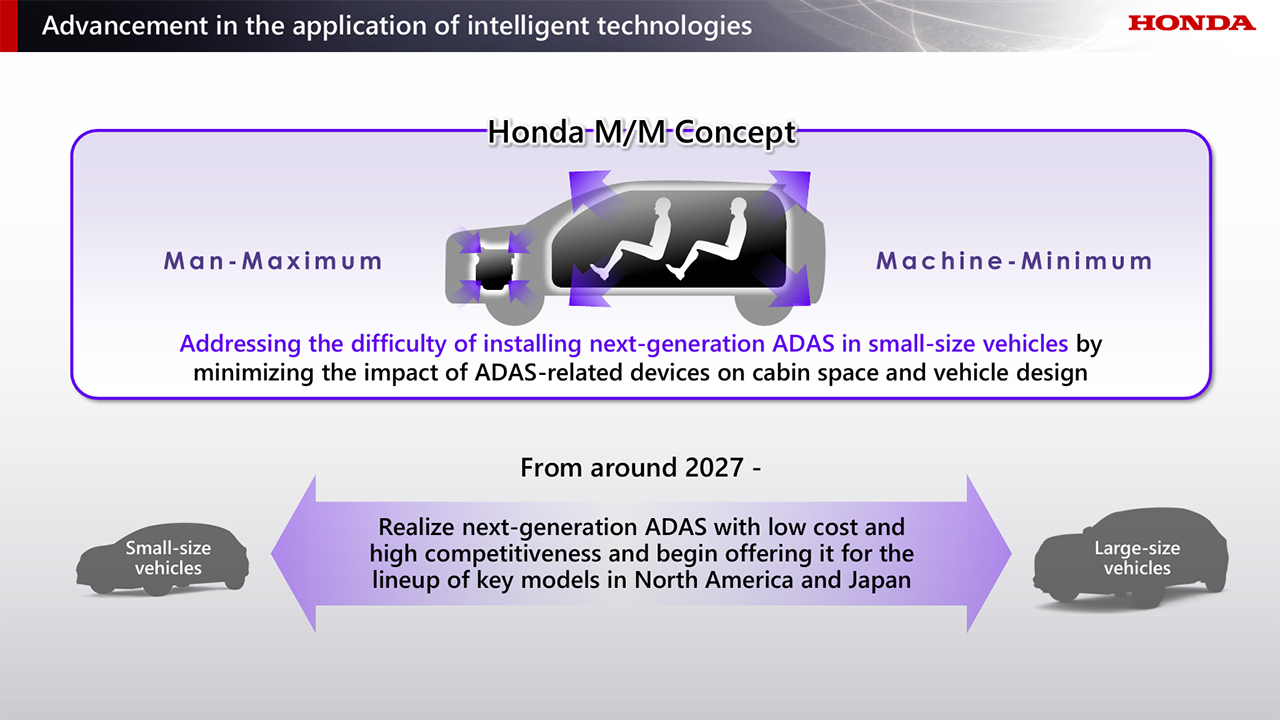 ในปัจจุบัน เทคโนโลยี ADAS รุ่นใหม่ยังถูกนำไปใช้ในรถยนต์ EV และ PHEV ระดับพรีเมียมเท่านั้น เนื่องจากมีอุปสรรคทางเทคนิค เช่น ข้อจำกัดด้านพลังงานและความต้องการระบบระบายความร้อนของ SoC อย่างไรก็ตาม ระบบไฮบริดของฮอนด้ามีข้อได้เปรียบทางเทคโนโลยีที่สามารถเอาชนะอุปสรรคเหล่านี้ได้ โดยการจัดการพลังงานอย่างมีประสิทธิภาพสูง อีกทั้งตามแนวคิด Honda M/M (Man-Maximum, Machine-Minimum) ซึ่งเน้นการเพิ่มพื้นที่สำหรับผู้โดยสารและลดพื้นที่ที่ใช้สำหรับชิ้นส่วนเครื่องกล ฮอนด้าสามารถติดตั้งอุปกรณ์ที่เกี่ยวข้องกับ ADAS ได้โดยไม่กระทบต่อพื้นที่ห้องโดยสารหรือการออกแบบตัวรถมากนัก จึงสามารถติดตั้ง ADAS รุ่นใหม่ในรถยนต์ขนาดเล็กได้ สำหรับในประเทศจีน ฮอนด้าจะร่วมมือกับบริษัท Momenta Global Limited ซึ่งเป็นสตาร์ทอัพจากจีนที่พัฒนาเทคโนโลยีขับขี่อัตโนมัติ เพื่อพัฒนา ADAS รุ่นใหม่ที่เหมาะสมกับสภาพถนนในจีน และติดตั้งในรถทุกรุ่นใหม่ที่ฮอนด้าจะเปิดตัวในจีนต่อไป