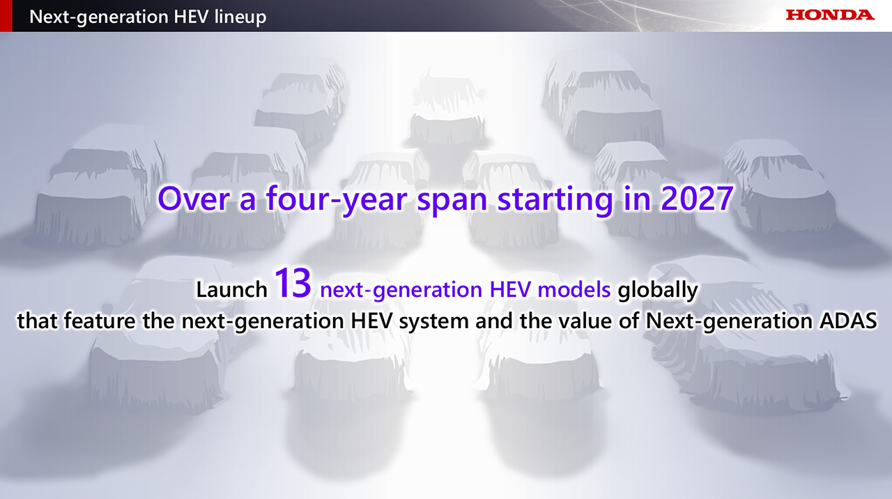 ฮอนด้าจะเปิดตัวรถยนต์ e:HEV เจนเนอเรชั่นใหม่ทั้งหมด 13 รุ่นทั่วโลก ภายในระยะเวลา 4 ปี เริ่มตั้งแต่ปี 2027 นอกจากนี้ “โลโก้ H แบบใหม่” จะถูกนำมาใช้ไม่เพียงแต่ในรถยนต์ไฟฟ้า เท่านั้น แต่ยังรวมถึงรถยนต์ไฮบริดด้วย โดยเริ่มใช้กับรถเจเนอเรชันใหม่ที่จะเปิดตัวตั้งแต่ปี 2027 เป็นต้นไป