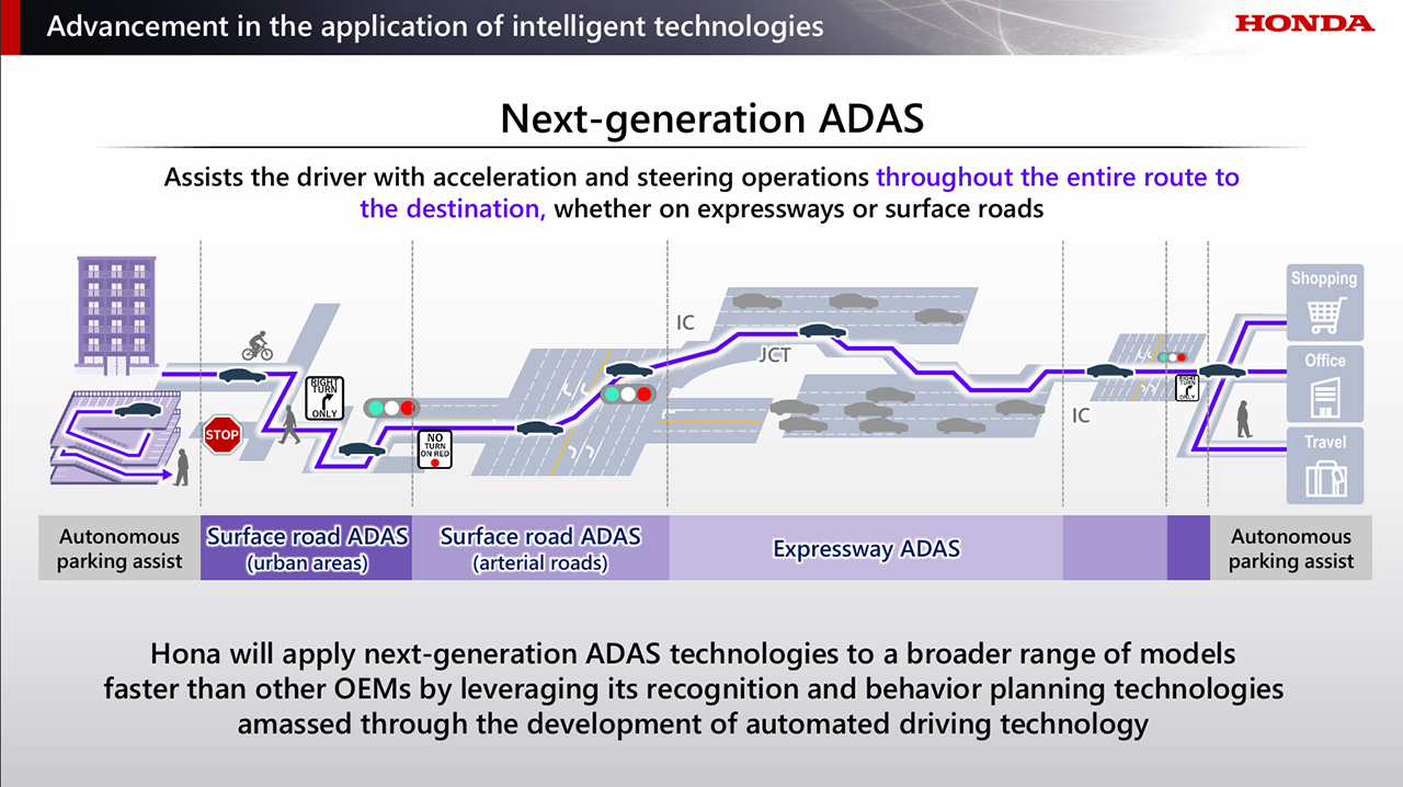 การพัฒนา ADAS รุ่นถัดไปนี้มีความท้าทายเป็นพิเศษในพื้นที่เมือง ซึ่งมีผู้ใช้ถนนหลากหลายประเภท และต้องมีการเลี้ยวตามแยกบ่อยครั้ง อย่างไรก็ตาม ด้วยการใช้เทคโนโลยีการจดจำและการวางแผนพฤติกรรมที่ฮอนด้าได้สั่งสมจากการพัฒนาระบบขับขี่อัตโนมัติ ฮอนด้ากำลังมุ่งมั่นพัฒนา ADAS รุ่นใหม่ที่ช่วยให้การขับขี่ปลอดภัยและสะดวกสบายตลอดเส้นทางไปถึงจุดหมาย แม้ในสภาพแวดล้อมในเมืองก็ตาม โดยฮอนด้ามีแผนนำระบบ ADAS รุ่นใหม่นี้มาติดตั้งในรถยนต์ไฟฟ้า (EV) และรถยนต์ไฮบริด (HEV) รุ่นหลักหลายรุ่นที่จะเปิดตัวในอเมริกาเหนือและญี่ปุ่นประมาณปี 2027