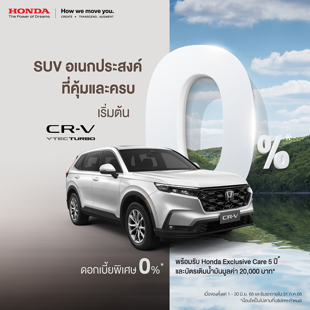 - CR-V e:HEV รับข้อเสนอดอกเบี้ย 0.99% พร้อมฟรีประกันภัย 1 ปี และฟรีฮอนด้า อัลติเมท แคร์ (Honda Ultimate Care) ขยายการรับประกันคุณภาพรถยนต์ใหม่ เป็น 5 ปี หรือ 140,000 กิโลเมตร