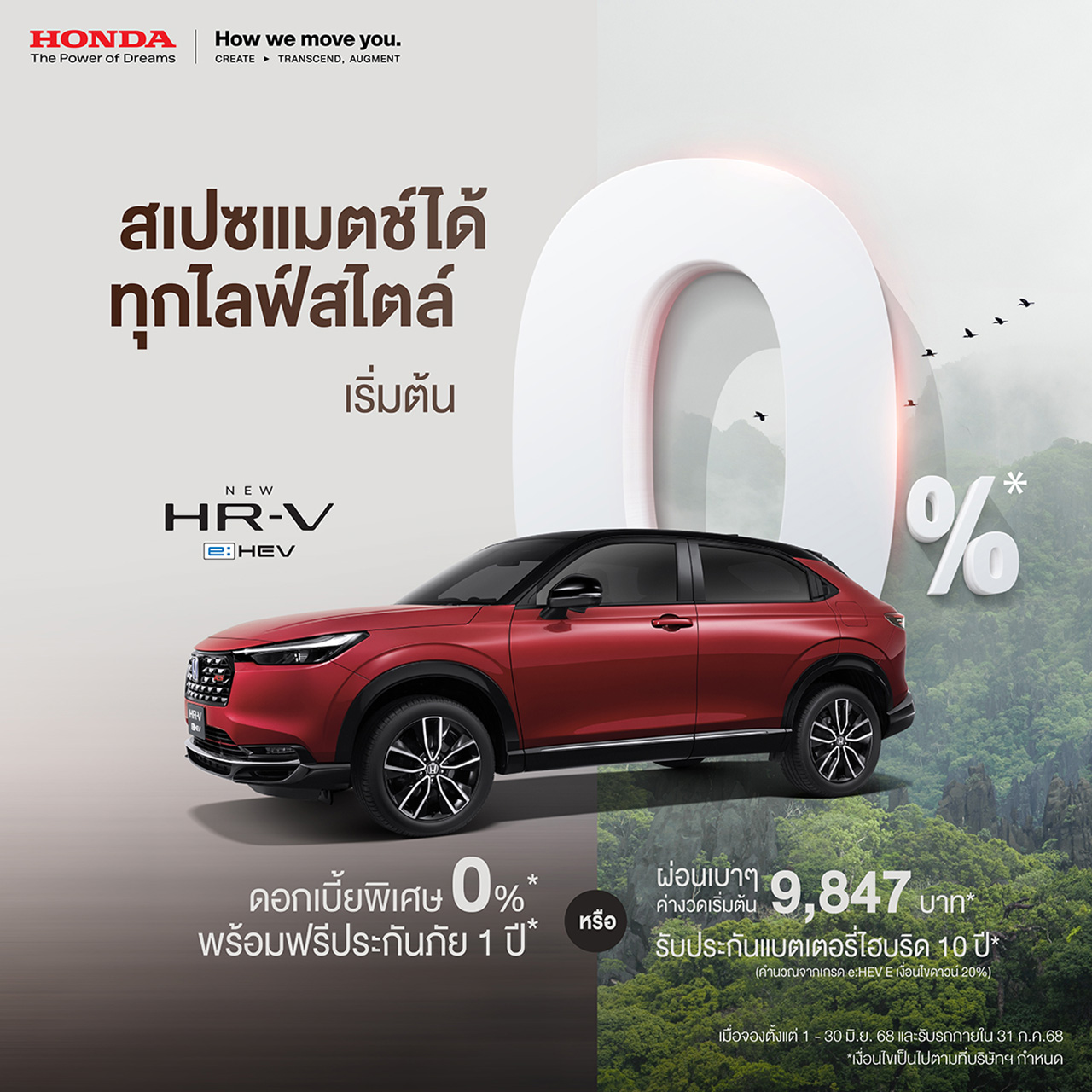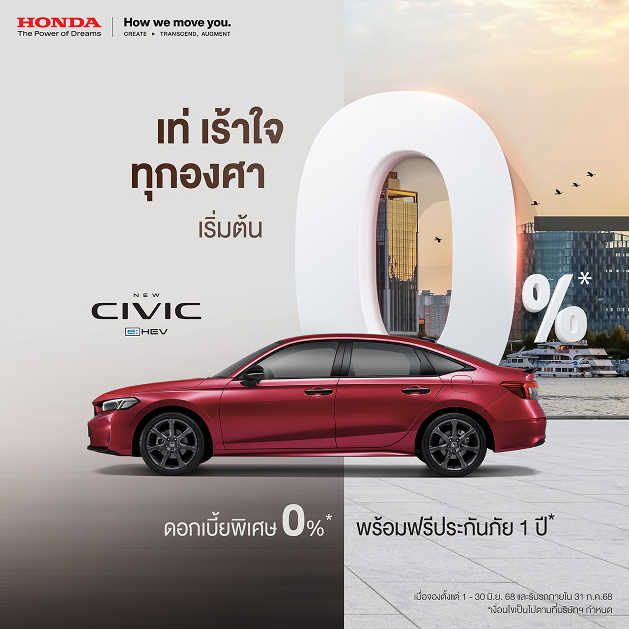 บริษัท ฮอนด้า ออโตโมบิล (ประเทศไทย) จำกัด จัดโปรโมชันพิเศษกลางปีสำหรับลูกค้าที่จองตั้งแต่ 1 มิถุนายน 2568 – 30 มิถุนายน 2568 และรับรถภายใน 31 กรกฎาคม 2568 โดยมีรายละเอียดดังนี้
