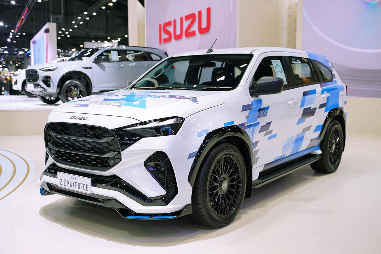 - MU-X “THE NEXT PEAK” รุ่น Active 2.2 Ddi MAXFORCE สีขาวมุกโดโลไมท์ (Dolomite White Pearl) ตกแต่งพิเศษด้วยคอนเซ็ปต์ “JAPANESE SPORT-SUV” เน้นคุณภาพและความเชื่อมั่นที่วางใจได้ บอดี้พาร์ทรอบคันจาก AKC ใส่ชุดโหลดช่วงล่างจาก PROFENDER ล้ออัลลอย LENSO รุ่น JAGER APOLLO พร้อมยาง YOKOHAMA ADVAN SPORT ขนาด 265/50R20 ขนาด 20 นิ้ว เบรกหน้า CALIPER แบบ 6 POT และเบรกหลัง CALIPER แบบ 4 POT พร้อมจานเบรกขนาด 355 มิลลิเมตร จาก Run Stop