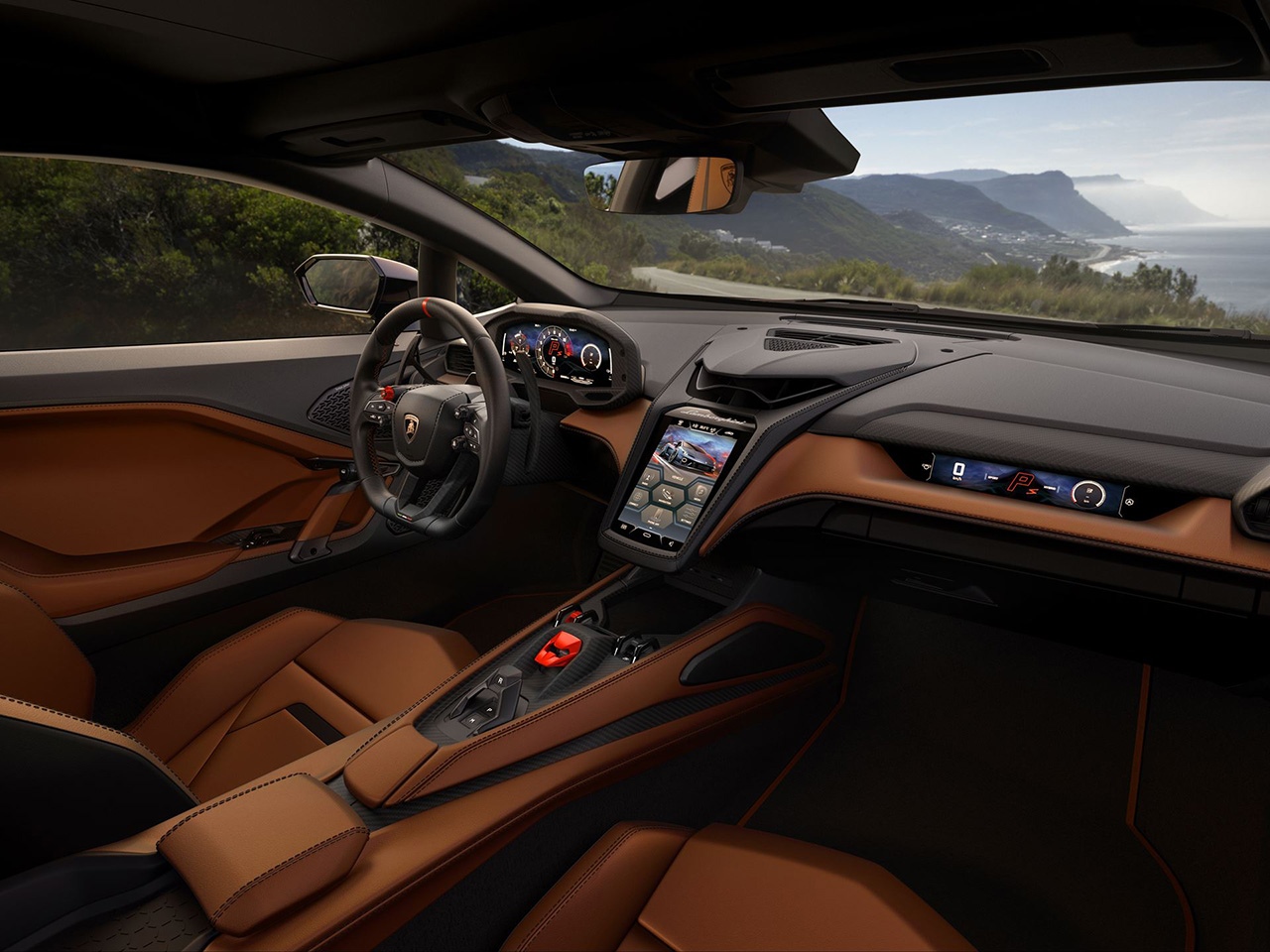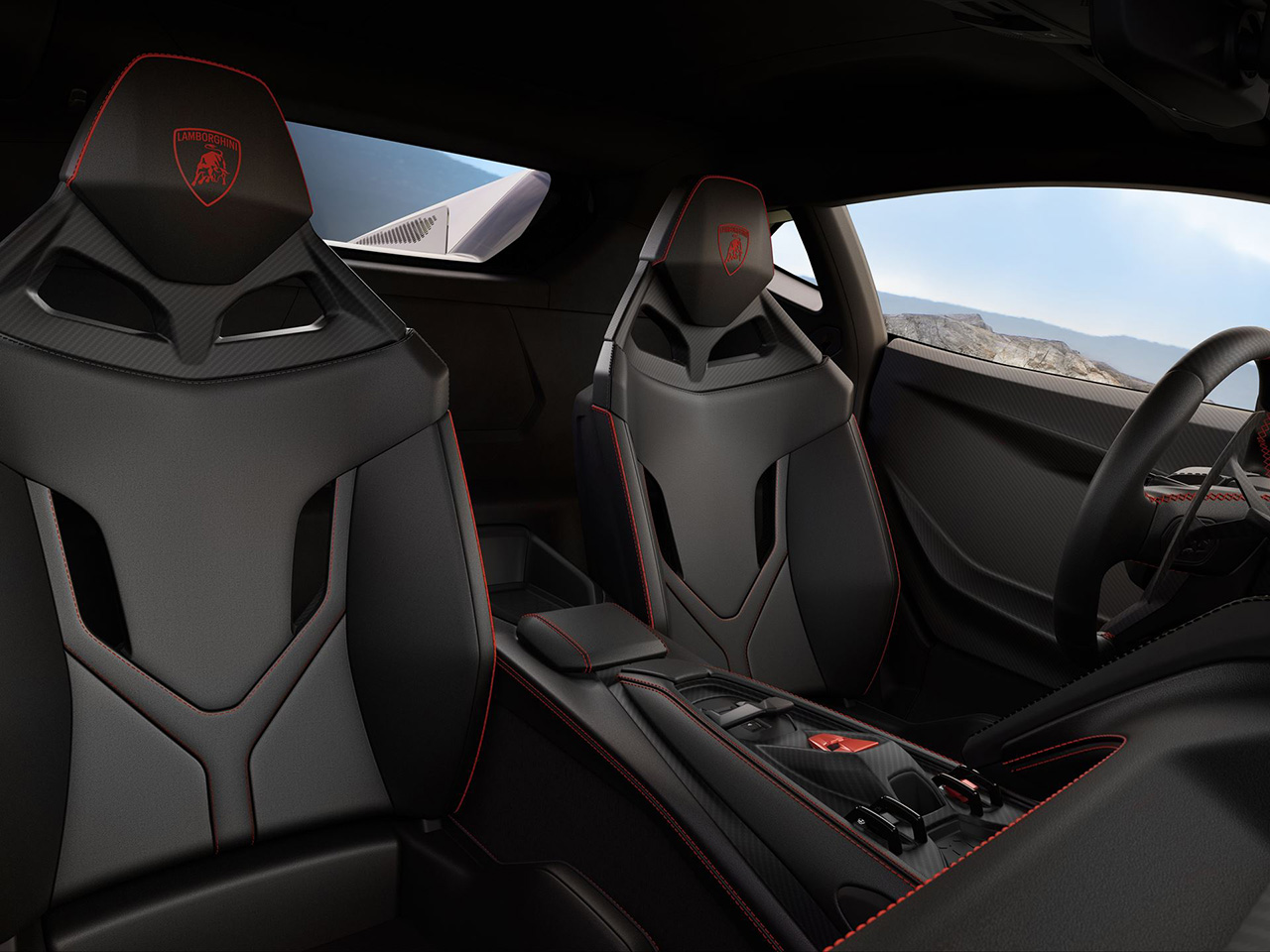 ภายในห้องโดยสารตกแต่งวัสดุคุณภาพสูง เช่น คาร์บอนไฟเบอร์, หนังแท้, และ ผ้าหนังกลับ Corsatex by Dinamica โดยหลายชิ้นส่วนสามารถเลือกเป็น คาร์บอนไฟเบอร์ ได้ เช่น แผงคอนโซลกลาง ช่องแอร์ แผงประตู แผงหน้าปัด พวงมาลัย และคอพวงมาลัย องค์ประกอบที่เป็นเอกลักษณ์ของ Lamborghini ก็ยังคงมีอยู่เช่นเดิม เช่น ปุ่ม Start/Stop แบบ Power Button ที่ได้รับแรงบันดาลใจจากเครื่องบิน คันเกียร์ไฟฟ้า e-gear แถบสีแดงบนพวงมาลัย พวงมาลัยสามารถเลือกเสริมด้วยคาร์บอนไฟเบอร์ โดยรวมปุ่มควบคุมฟังก์ชันการขับขี่หลักทั้งหมดไว้ในมือเดียว ด้านซ้ายมือของพวงมาลัยมี ตัวหมุนสีแดง (Red-Crowned Rotor) สำหรับเลือกโหมดการขับขี่ ด้านล่างประกอบด้วย ปุ่มยกตัวรถ (Lift Function) ปุ่ม Race Start สำหรับออกตัวแบบรถแข่งและสวิตช์ไฟเลี้ยวอยู่ตรงกลางระหว่างทั้งสองปุ่ม