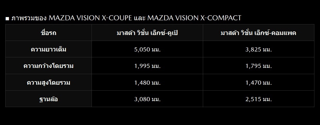 มาสด้า  VISION X-COUPE ถือเป็นรถครอสโอเวอร์คูเป้ที่ยกระดับภาษาการออกแบบ KODO ของมาสด้าให้ก้าวล้ำยิ่งขึ้น โดย KODO ซึ่งแปลว่า "วิญญาณแห่งการเคลื่อนไหว" ได้รับการพัฒนามาตั้งแต่ปี 2010 เพื่อถ่ายทอดความงามของการเคลื่อนไหวแบบธรรมชาติลงสู่รูปทรงรถยนต์ รุ่นนี้มาพร้อมระบบขับเคลื่อนแบบปลั๊กอินไฮบริด (PHEV) ที่ผสานรวมเครื่องยนต์โรตารี่เทอร์โบสองโรเตอร์—เทคโนโลยีอันเป็นเอกลักษณ์ของมาสด้าที่เคยหายไปจากสายการผลิตมานาน—เข้ากับมอเตอร์ไฟฟ้าและแบตเตอรี่ลิเธียมไอออนรุ่นล่าสุด สร้างพลังสูงสุดถึง 510 แรงม้า โดยสามารถวิ่งด้วยไฟฟ้าล้วนได้ไกล 160 กิโลเมตร และรวมระยะทางทั้งหมด 800 กิโลเมตรเมื่อใช้เครื่องยนต์ร่วมด้วย ซึ่งเทียบเท่ากับการเดินทางข้ามประเทศโดยไม่ต้องเติมเชื้อเพลิงบ่อยครั้ง