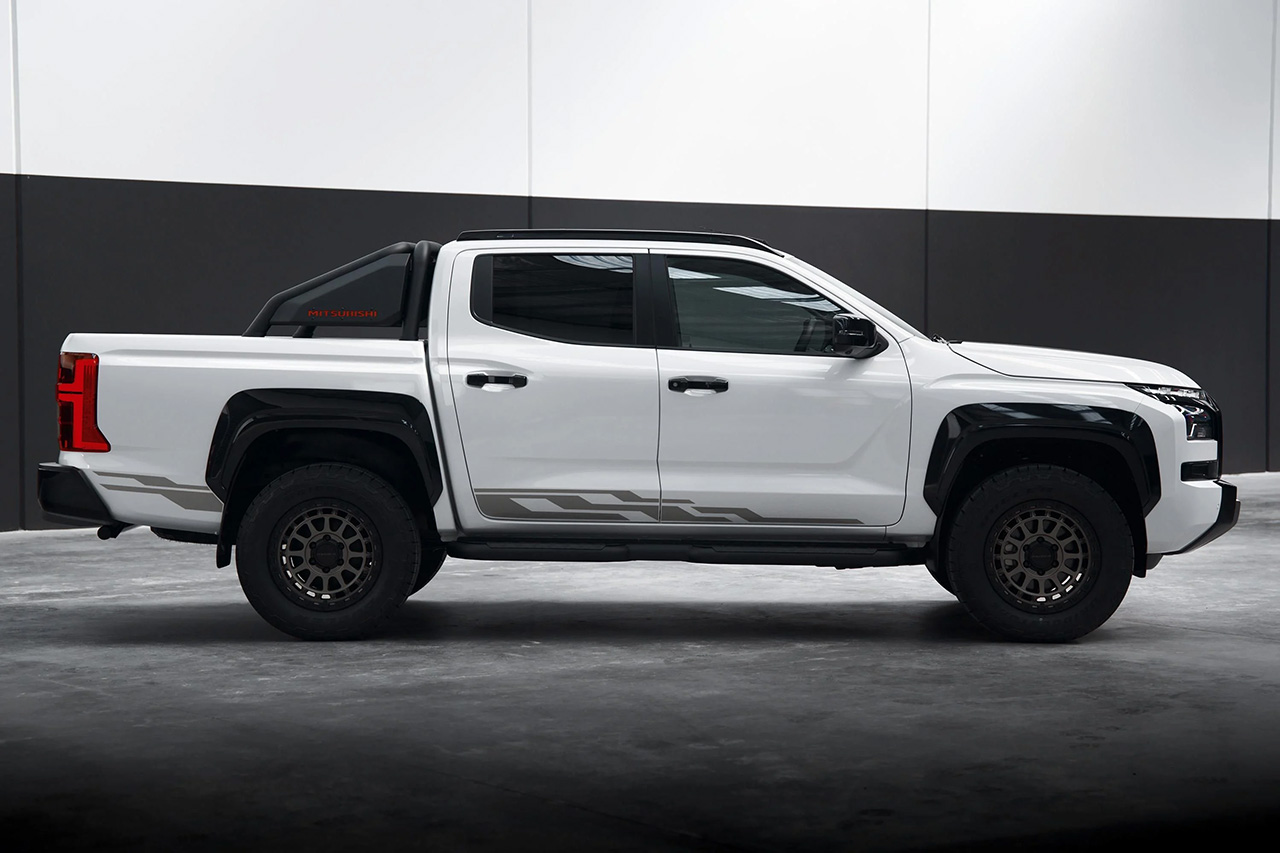 นอกจากนี้ยังติดตั้งอุปกรณ์ตกแต่งแท้ของ Mitsubishi เช่น แถบกันกระแทกด้านข้าง โรลบาร์ และแผ่นกันกระแทกใต้ท้องรถเป็นอุปกรณ์มาตรฐาน พร้อมโลโก้กระจังหน้าโครเมียม